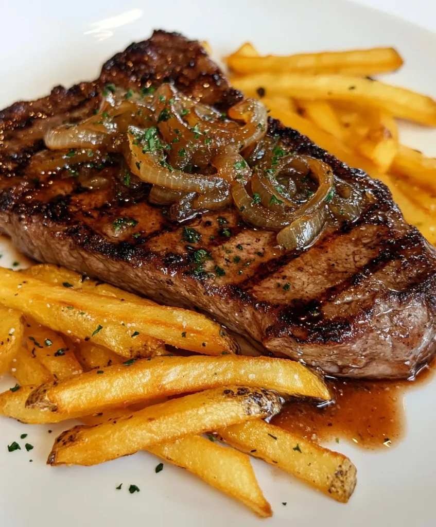 Ein köstliches Rezept für Ribeye Steak mit karamellisierten Zwiebeln und Pommes Frites, ideal für besondere Anlässe oder ein gemütliches Abendessen.